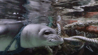 被廢棄物纏繞的海豹,脖子(zǐ)上出現一條深深的血痕