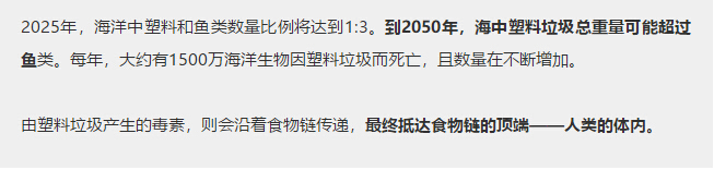 由塑料垃圾產生的(de)毒素,則會沿著食物鏈傳(chuán)遞,最終抵(dǐ)達食物鏈的頂端——人類的體內。