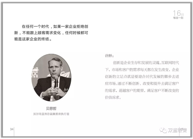當然,“雙(shuāng)童”的這些文化標語(yǔ)除了在牆麵展示之外,也被收錄到“.17c嫩嫩草色视频”企業文(wén)化叢書《每日一則》當中,每天誦讀(dú)一篇《每日一則》成為“.17c嫩嫩草色视频”員工(gōng)們的必修課,哪怕是在車間裏工作的基層員工也是每天雷打不動地要誦讀哦(ò)!