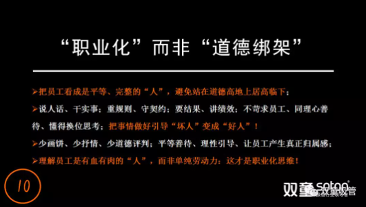 在中國傳統文(wén)化中,“情”是最重要的,“理(lǐ)”和(hé)“法”則次之。雖然(rán)中國自古也倡導誠信和道德,但基本靠內心良善的意(yì)識喚醒(xǐng)、而非外在規則。現在很多企業(yè)把人情、情懷、感恩放到管(guǎn)理當中(zhōng),然(rán)而這種人(rén)性(xìng)中的(de)“情懷”隻能短期激發,如果長期靠情懷,一定會出現精(jīng)神麻(má)痹(bì)。企業是一個運行(háng)當中的商業團體,應該用規則和契約來規(guī)範員工與企業的關係,強調感恩是用虛無縹(piāo)緲的道德去“綁架”員工!