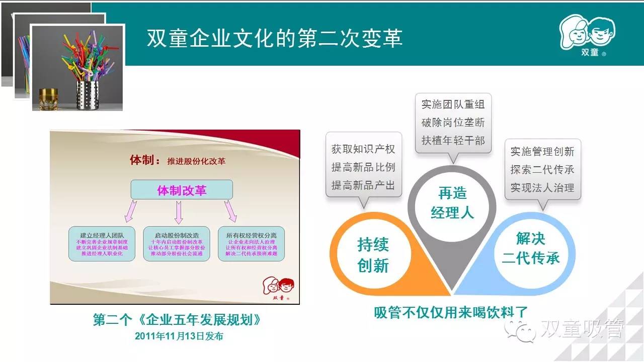 第一個五年下來,廠子還是那(nà)麽大,人均產出卻提高近8倍。2011年雙(shuāng)童開始做第二個五年規劃,仍是三個重點:一是加快創(chuàng)新步伐,二是完成經理團隊重組,三是著手(shǒu)解決民企二代(dài)傳承問題。