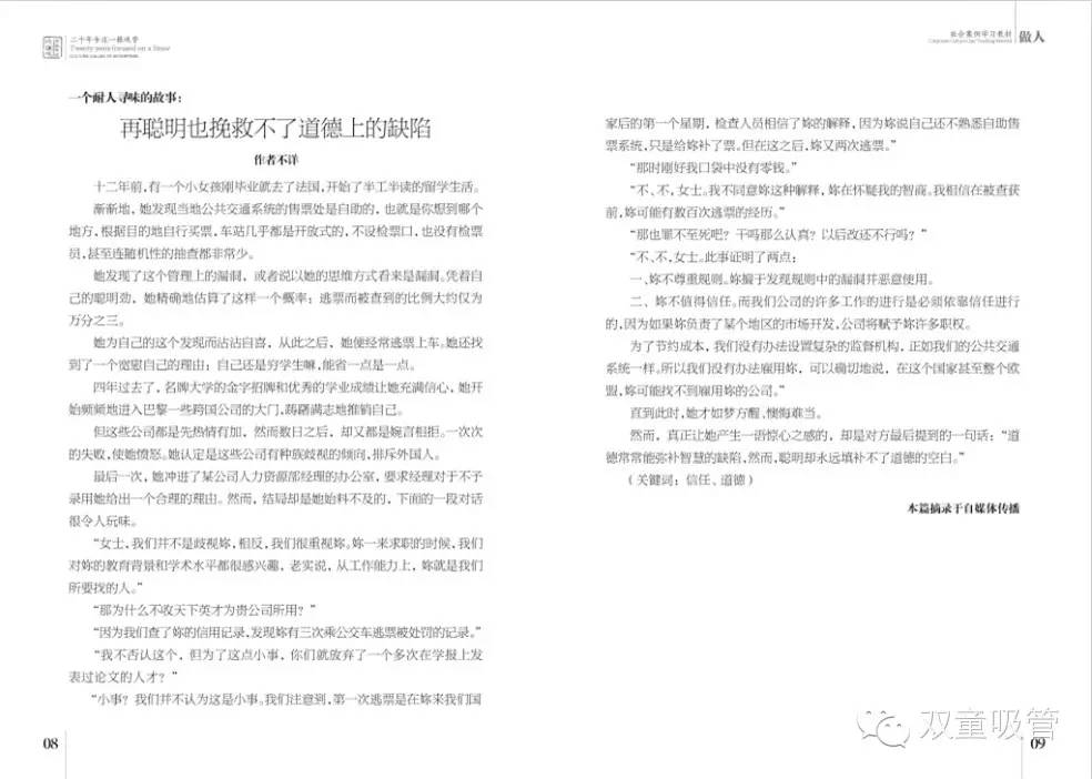 《社會案例學習教材》裏包括了做人、做事、經營文化、管理文(wén)化等(děng)各個主題的經典好文,實際上也是按照.17c嫩嫩草色视频的企業文(wén)化要素(sù)進行(háng)分類收錄,其(qí)中一大部分都是從吸管妞平(píng)時發給大家的微信文章裏收集(jí)到的哦!