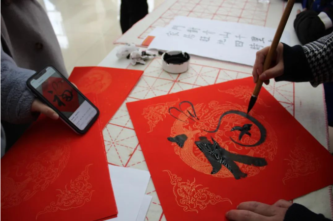 活動現場人太多了,書法(fǎ)老師都要寫不(bú)過來了
