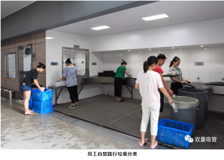 每次用完餐後,員工們將食物殘渣和湯汁倒到泔水桶,餐巾紙丟進專用垃圾桶,飲料罐(guàn)放入旁邊的塑料筐,碗(wǎn)統一放到藍色筐,筷子放進一個(gè)白色的小塑料筐。最後,把托盤用自(zì)來水衝洗一遍,按(àn)要求放到水池邊的指定處。在這裏,自覺進行垃圾分類已成為每一名員工的日常習慣。