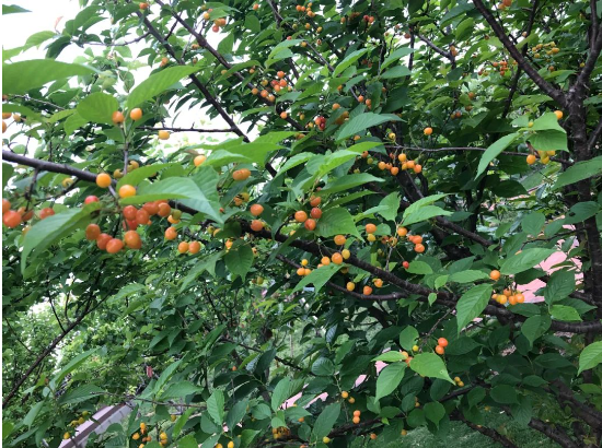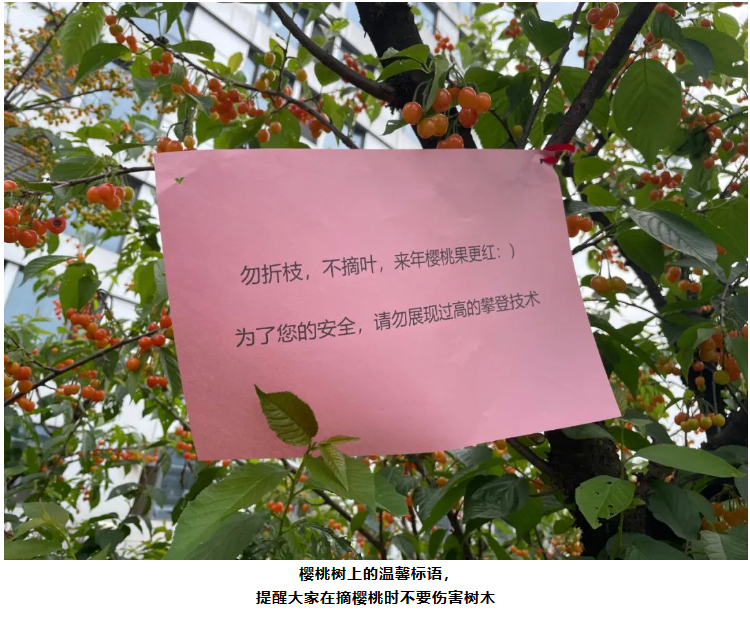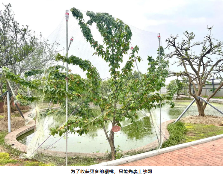吸管妞可是眼看著這些櫻桃(táo)由青轉黃,由黃轉橙,最後變成(chéng)紅色的呢!由於光照條件(jiàn)不(bú)同的關係,現在不少果實還是橙色的。隻是沒想到,由於櫻桃太過於可口,不少(shǎo)鳥(niǎo)兒都爭先啄(zhuó)食。為了(le)讓更多果實留存(cún)下來,讓員工和遠道而來的客人(rén)們可以品嚐(cháng)到新鮮美味的櫻桃,園丁叔叔給還未完全成熟的(de)櫻(yīng)桃樹裹(guǒ)上了(le)紗網。