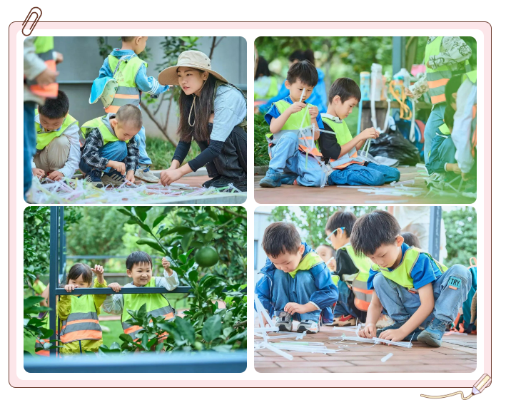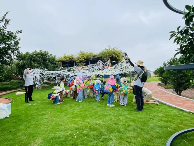 當然,幼兒園的老師們也精心準備(bèi)了益智遊戲——編製吸管網。也就是(shì)把吸(xī)管作為“網線”,一點一點拚接為一張很大的(de)網。看,小朋友們做的多麽認真。
