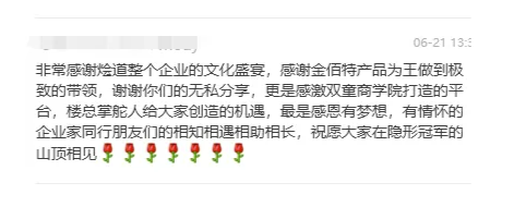 他以運營(yíng)總經理(lǐ)吳春雲曾經發的一段話(huà)作為結尾:我(wǒ)們當以隱形冠(guàn)軍之名(míng),列鴻鵠(hú)之誌,持堅韌之心,深耕(gēng)細作,勇(yǒng)攀(pān)高峰(fēng)。未來征途,我們必將在各自領域發光發熱,也期待著(zhe)下次相聚(jù)。我們都已(yǐ)成為更好的自己,共同見證更多隱形冠(guàn)軍的誕生!