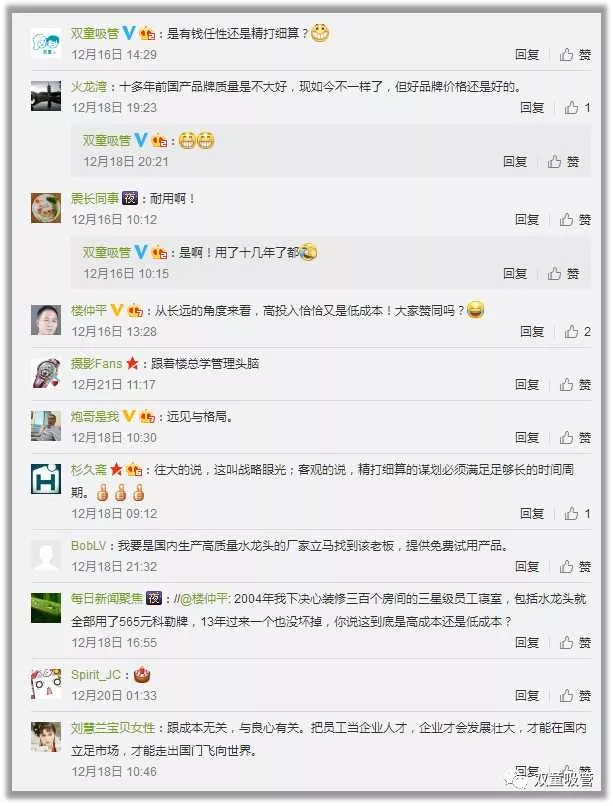 許多民營企業都認為不必(bì)給員工用太好的硬件,希望用最低的成本創造最大的價值。因此,前段(duàn)時間,“雙(shuāng)童”官方微(wēi)博發布了一條關於12年前老板(bǎn)給每個員工寢室(shì)配置了五百多元高(gāo)級水龍頭的微(wēi)博就引發了網友的熱議,不少粉(fěn)絲都很詫異一個水龍頭五百多元老板居然說不貴!這樣(yàng)的高硬件配置究竟是低成本還是高成本?今天吸管妞就和大家來好好算算這(zhè)筆賬劃不劃算!