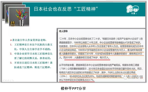 2016年,樓仲(zhòng)平曾幾度(dù)受日本法政大學和亞洲企業研究會的邀請到(dào)日(rì)本分享《匠人思維》。在分(fèn)享過(guò)程(chéng)中,樓仲平發現了一個(gè)很明顯的問(wèn)題,基本上來聽課學習的幾乎是60歲以上的日本企業主,幾乎看不見年輕人!究其原因,是(shì)由於極致的工匠精神讓日本(běn)的年輕人不願意接班。1995年以來的二十年間,日本中小企業經營者年齡(líng)峰值從47歲變成了66歲,到了2015年,人數最多的又變成了66歲,有23萬人。也就是說,日本中小企(qǐ)業領導(dǎo)人(rén)從中年人為(wéi)主變成了老年人為主,經營層老齡化成為日(rì)本中小企業的突出特征!