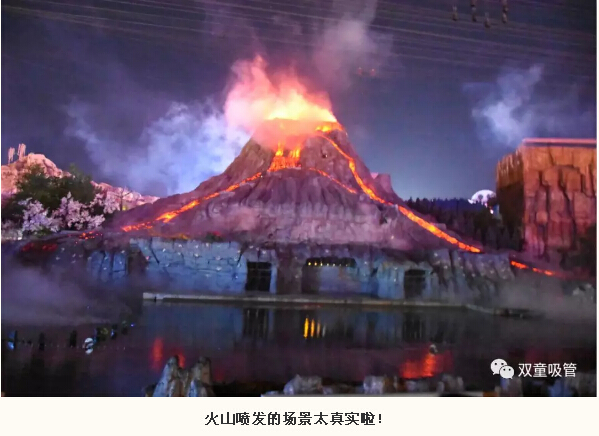到了晚上7點30分,精彩的表演(yǎn)開始了!高35米的火山在漆黑的夜幕中突然(rán)爆發,熱浪衝天,火山熔岩漿滾滾(gǔn)而下…… 整個演出使用了激光高科技,將水麵和(hé)空中演繹的若夢若幻,美輪美奐,讓大家震(zhèn)撼到讚不絕口!