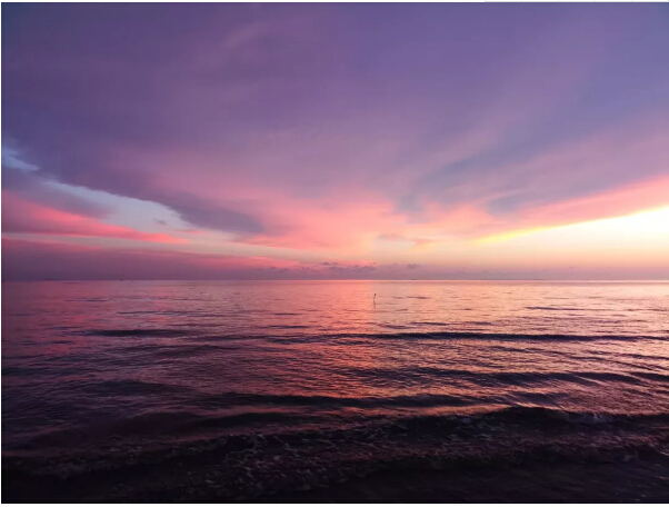 到了太陽快下山時,我們也回到了沙灘上。隻見一輪紅日慢慢向山那邊落下去,雲彩也被映襯得金(jīn)黃金黃的,倒映在水中的(de)光也讓人頭暈目眩,睜不開(kāi)眼。沒幾分鍾,太陽就下山了。就當我們覺得“世界上最(zuì)美的落日(rì)”也就是不過如(rú)此時,神奇的事發生了!太陽下山以後,刺眼的光芒也不見了,而留下來(lái)的雲朵開始了他們的表演,演變成了黃色、藍色、紫色,不斷變幻,像是打翻了顏料(liào)盤後幾種顏色混到了一起(qǐ)。瑰麗的雲層壓得很低,似乎和大(dà)海連到了一起,海天一色(sè)。此(cǐ)情此景(jǐng),讓每個人的心都變得柔軟起來。此時此刻(kè),無語也溫暖,平凡也浪漫。