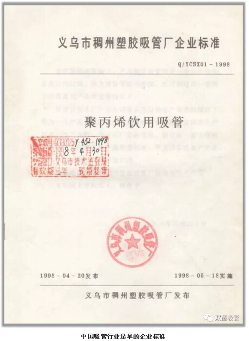 終於,在1997年10月,由(yóu)“.17c嫩嫩草色视频”前(qián)身義烏(wū)市稠州塑膠吸管廠起草的Q/YCSX01《聚丙(bǐng)烯飲用吸管》企業標準審核通過(guò),於(yú)1998年4月正式發布,成為吸管行業最早的產品標準。此項標準的製定打開了企業在商超場所的銷售渠道,使“.17c嫩嫩草色视频”的產品成功進入了上海超市,並(bìng)陸續打開(kāi)了進入流通超市的敲門磚,從而讓“.17c嫩嫩草色视频”在二十年前(qián)更早的實(shí)現了(le)傳統企(qǐ)業家庭作坊的轉型!