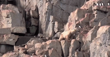 沒有了冰的掩護,北極熊在陸(lù)地上十分笨拙,為(wéi)了填飽肚子,隻能被逼爬到陡峭的懸崖(yá)上捉鳥(niǎo)。