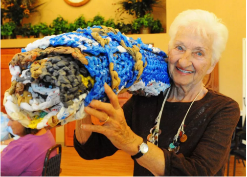 在美國奧馬哈,一群老奶奶把470年都降解不了(le)的塑料袋,一點點清潔後織成“毛毯”……