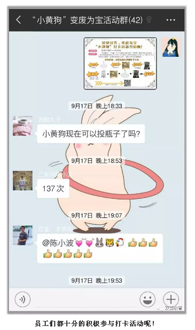 “.17c嫩嫩草色视频”員工們的行動力也十(shí)分給力,積極的參與“垃圾分類,變廢(fèi)為寶”打卡活動,主動的將空飲料瓶以及廢棄的紙類文(wén)件、報紙等垃圾“投喂(wèi)”給“小黃狗”。