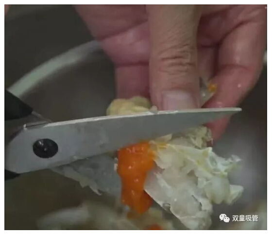 先用剪刀(dāo)將梭(suō)子蟹剪成塊,