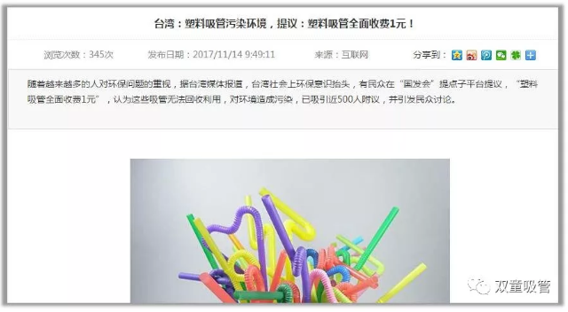 而台灣媒體也報道,有民眾在“國發會”提點子平台提議,“塑料吸管全麵收(shōu)費1元”,因為這些吸管無法回(huí)收利用,對環(huán)境造成汙染(rǎn),這一點子引發民眾熱烈討論……