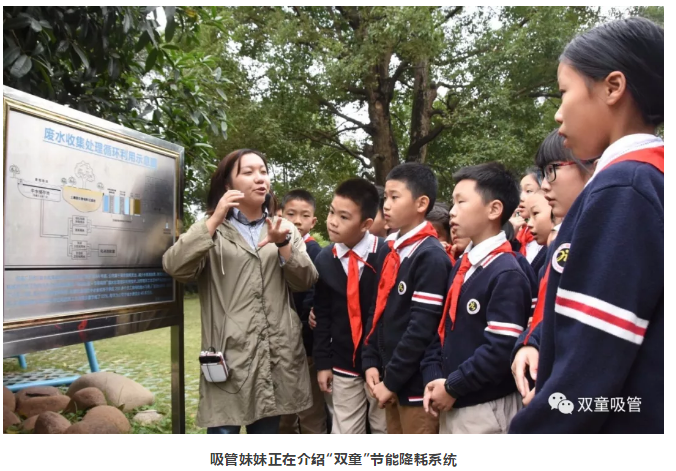 在介紹“雙(shuāng)童”節能降耗係統時,吸管(guǎn)妹(mèi)妹介紹了(le)“雙(shuāng)童(tóng)”員工產生的(de)廢水、雨水都會收集起來並進行循環利用。雨水處理後可用於員工生活用(yòng)水,廢水處理後用於綠化噴淋、馬桶衝水等,每年都為企業省下近(jìn)百萬元!孩子們(men)聽(tīng)後直呼好神奇!
