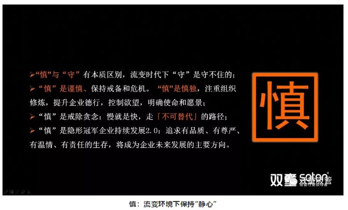 其實,“慎”跟“守”有本質區別。流變時代下,“守”是守不住(zhù)的。“慎”,對企業來說是要認(rèn)識到這個時代給我們(men)帶來的巨變衝擊,並知道自己的不足和短板。所(suǒ)以,“慎”是(shì)保持(chí)謹慎(shèn)、戒備和危機。