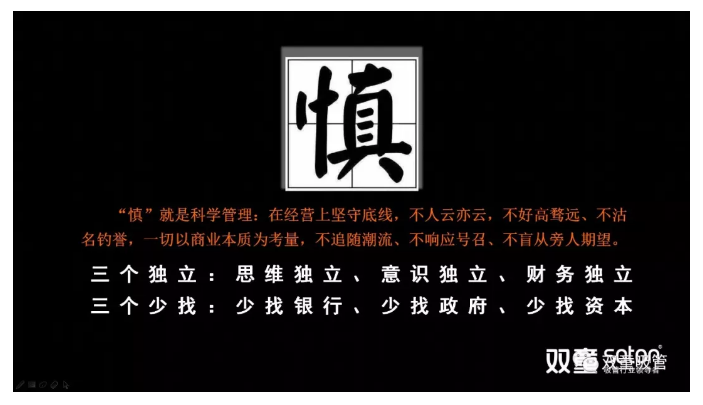 更深層次(cì)講,“慎”是慎獨,也就是說中國(guó)經濟發展到(dào)今天,企業在發展過程中不能像粗放時期一樣完全追求規模(mó)、追求(qiú)占有、追求薄利多銷……