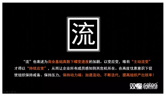 第二個字是“流”。在高速變(biàn)化的時代,資源(yuán)和信息高速流變,人才高度流動……在這樣的大環境下,企業發展呈現出一種不可預測的情況。作為行業細分(fèn)的領先企業,你應該通過主動的方式、迎合(hé)的方式、應變的方式、創新的方式,從(cóng)而保持企業有序流動,保持創新。