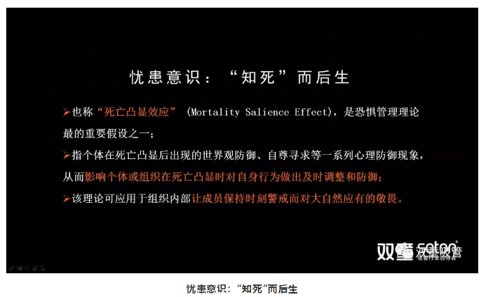 舉個例子。人類是所有動物當(dāng)中(zhōng)唯一知道自己要死(sǐ)的動物,從(cóng)而對(duì)自己的死有所準備、有所意(yì)識、有所恐懼,有(yǒu)所戒備(bèi),從而更早地讓我們有幹預,讓我們去迎合和改變。這(zhè)樣(yàng)一種“死亡凸顯效應”就叫(jiào)“知死而(ér)後生”。