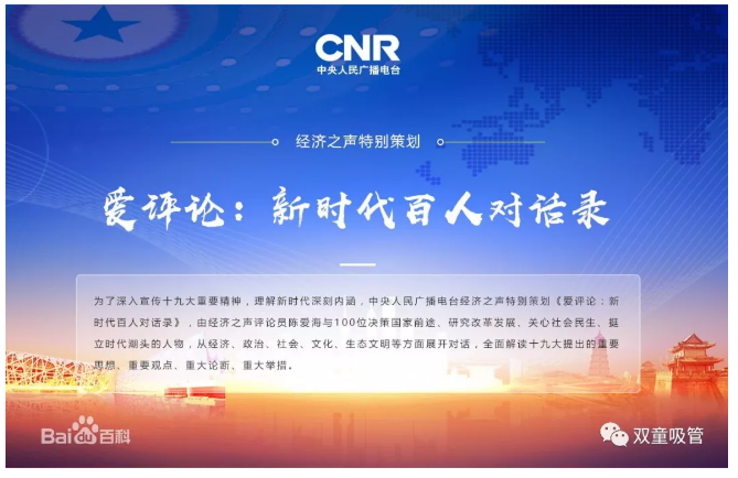 《愛評論:新時代百人對話(huà)錄》,由中央廣播電視總台經濟之聲首(shǒu)席評論員陳愛海與100位決策國家前途、研究(jiū)改革發展、關心社會民生、挺立時代潮(cháo)頭的(de)人物,從經濟、政治、社會、文化(huà)、生態文明等方麵展開對話,引領方向、引導輿(yú)論、引發思考,彰顯國家電台(tái)的傳(chuán)播力、影響(xiǎng)力、公信力。