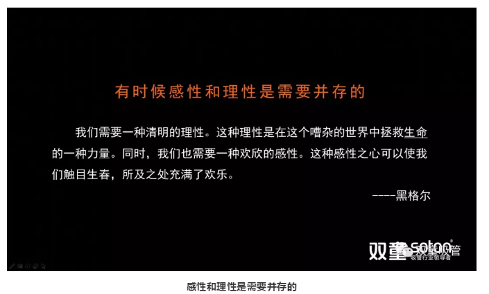 通過中西方文化的對比,我們可(kě)以發現(xiàn):我們不能隻有(yǒu)“感性(xìng)思維”,但(dàn)也不能一味的倡導(dǎo)西方(fāng)的“理性思維”。唯(wéi)有“以中為體、以西為用”,將感性思維和理性思維相融合(hé),才能更(gèng)好地平衡工作和生活!最後,樓仲平也巧妙的(de)用黑格爾的名言分享了感性和理性是需要並存的。