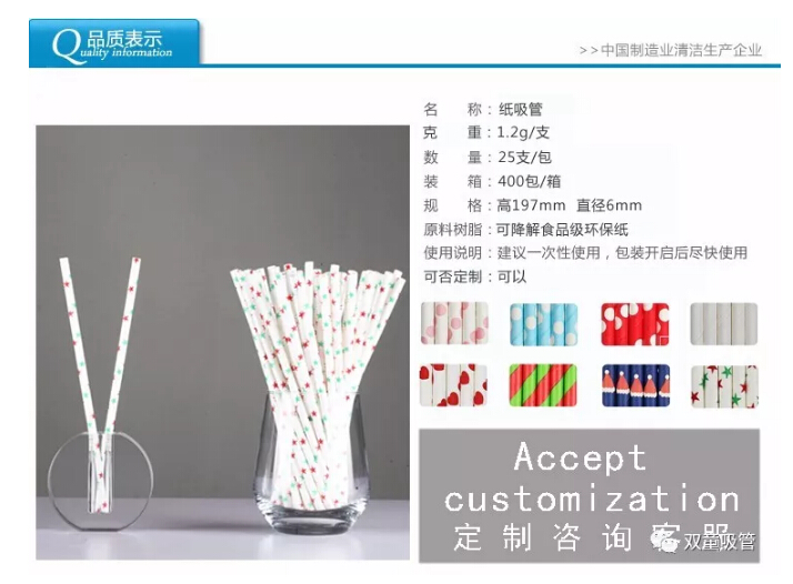 相對於塑(sù)料吸管,紙質吸管以(yǐ)食品接觸類原紙為主要材料,並能用大豆基油墨印刷各類花色,在顏(yán)色鮮(xiān)豔飽滿的同時,確保安全無毒無異味,在回(huí)收廢棄後(hòu)三到四個(gè)月內可完全降解,符合歐美國家對食品安全包裝的衛生(shēng)要求,可用於生日派對、餐飲連鎖、家庭消費、兒童DIY用具等各類場所!