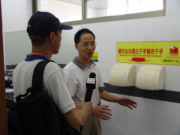 上圖為公司董事長樓仲平先生(圖(tú)左)在解說雙(shuāng)童公司特有的“廁(cè)所文化”