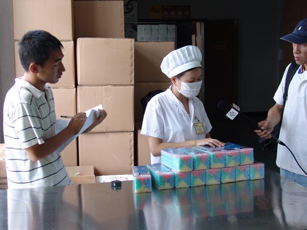 上圖為寧波客戶(圖左)來廠驗貨(huò)現場,公司終檢人(rén)員(圖中)在一邊檢驗一邊向記者說明產品質(zhì)量檢驗標準