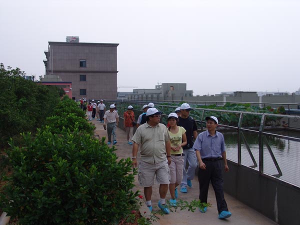 上圖為公司(sī)張國俊(右一)副總經(jīng)理向企業代表團(tuán)介紹循環經濟屋頂綠化(huà)節能降耗情況