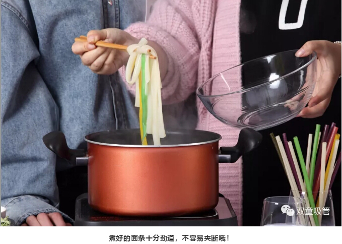 用“雙(shuāng)童(tóng)”可食用澱粉吸管煮麵條,不論是湯(tāng)麵、醬麵(miàn)還是拌麵,那味道都是杠杠滴(dī)!連懷孕了的吸管(guǎn)妞和年幼的小朋友都(dōu)能放心享用哦!