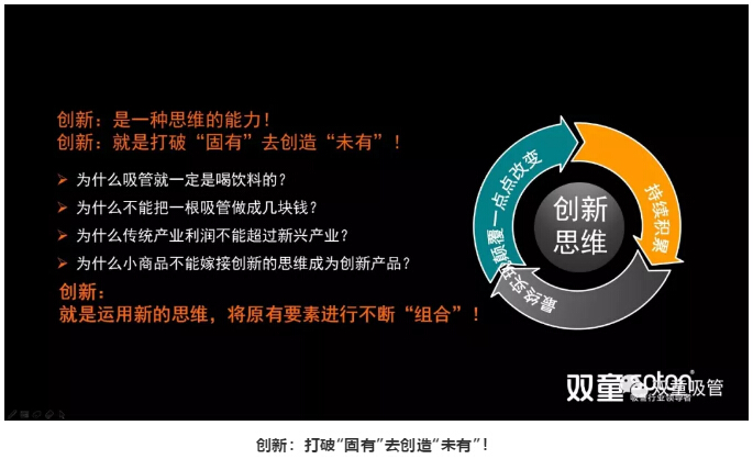 現在,不少人動不動就喊要創新,但是到底什麽是創新?我一直(zhí)理解創新工作的本(běn)質在於“思維(wéi)創新”,就是運(yùn)用新的思維,將原有要素進行不斷(duàn)“組合”,打破“固有”創造“未有”。隻有用創新思維(wéi)去做產品、做(zuò)事業,才能改變(biàn)自己(jǐ)乃至於整個企業(yè)的命運!