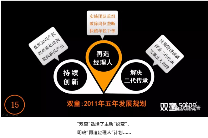 基於上述瓶(píng)頸,公司在2011年發布了第三(sān)個《企業(yè)五(wǔ)年發展規劃》,明確“再造經理人”計劃,明確領導層更替:選拔培養年(nián)輕領導層、重要崗位領導年輕化、明確實施股份製改革,慢慢解決管理層老化問題!