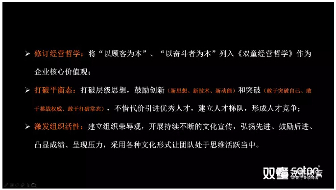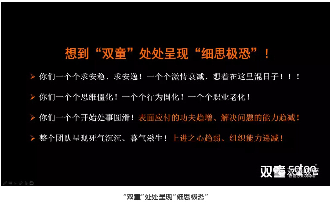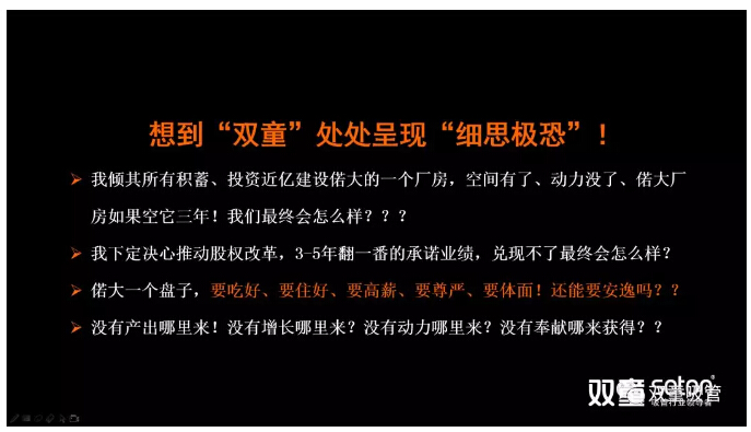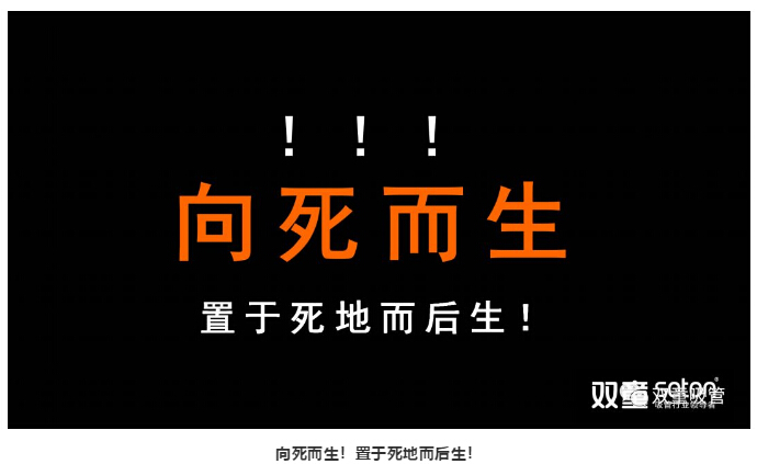 原來,“雙(shuāng)童”當家人樓仲(zhòng)平充分認知到社會環境的(de)複雜性、時代的巨變性和企業的自然墮變性,與總經理李二橋充分(fèn)評估時勢,權衡舍得,決定再次發起2019企業重大(dà)改革,以此激發活力、砥礪前行,通過“向死而生”的命題(tí)假設讓團隊認知(zhī)到雙(shuāng)童離“死亡(wáng)”隻有六個月,以此激發(fā)員工的危機感,從而讓“雙(shuāng)童(tóng)”再次脫離(lí)“舒適區”,遠離“危險區”,進(jìn)入(rù)“恐慌區”,以此激發(fā)組織活力!