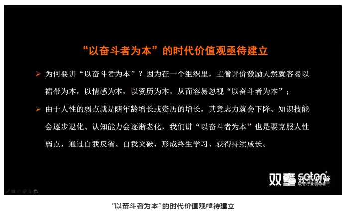 為什麽要以“奮鬥者為本”?由於人性的弱(ruò)點就是隨年齡增長或資曆的增長(zhǎng),其意(yì)誌(zhì)力就會下降、知識技能會逐步退化、認知能力會逐漸老化,我們講“以奮鬥者為本”也是要克服人性弱點,通過自我反省、自我突破,形成終生學習、獲得持續成長!