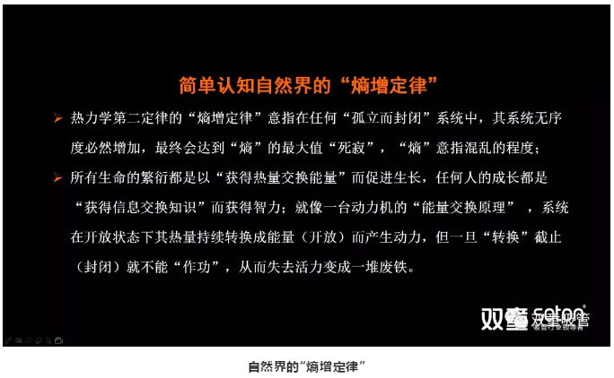 “熵增定(dìng)律”意指在任何“孤立而封閉”係統(tǒng)中,其係統無序度必然增加,最終會達(dá)到“熵”的最大值“死寂”。任(rèn)何一個人,任何一個(gè)組織(zhī),乃至於(yú)任何一個家庭,如果你把自己封閉起來,你的內部(bù)一定是從有序到無序。如果你繼續(xù)封閉,它的混(hún)亂程度(dù)一定會(huì)達(dá)到(dào)最大值,一直到死寂。