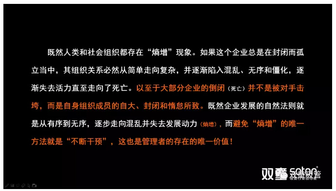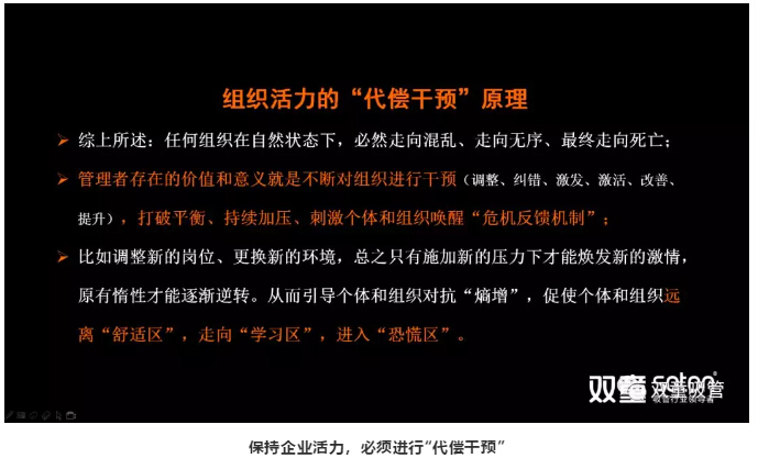 而避免“熵增(zēng)”的唯一(yī)方法就是持續開放和組織幹預,從而(ér)打破平衡,持(chí)續加壓、刺激個體和(hé)組織喚醒“危機反饋機製”,這也是管(guǎn)理者的存在的唯一價值(zhí)!