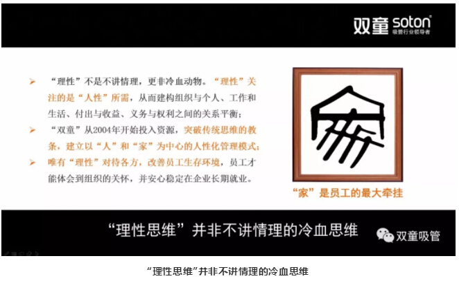 另(lìng)一方麵,公司建立了以(yǐ)“人”和“家”為中心(xīn)的人性化管理模式。很(hěn)多員工(gōng)的家屬和(hé)小孩成群結隊地在食堂吃飯,並生活在企業內部。同時,“雙(shuāng)童”又一直引導員工“公司不是(shì)我的家”,理解“責、權、利”平衡下的奉獻關係,關注“人性”所需並給予員工必要關愛,從而達(dá)到(dào)組織與個人之間的關係平衡。