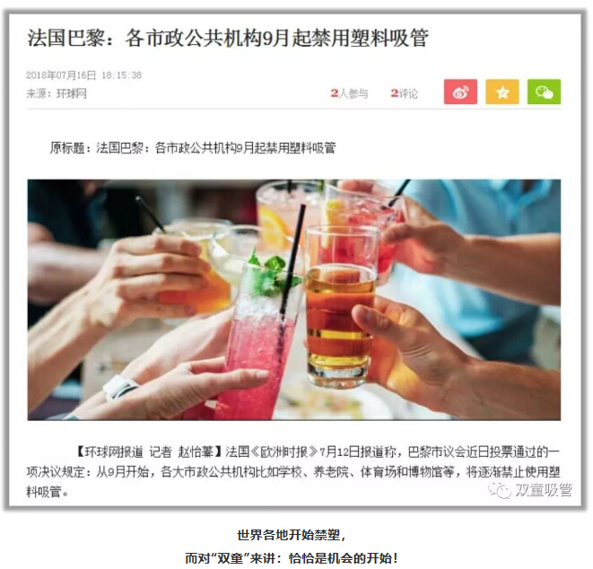 由於塑料吸管難以(yǐ)反複利用,隨之而產生的(de)白色(sè)汙染給(gěi)環(huán)境帶來了巨(jù)大的(de)傷害,引發了越來越多(duō)人的(de)關注!近年來,全球多地政府掀起“限塑”熱潮(cháo),至此,“雙(shuāng)童”意識到:塑料產業麵臨徹底(dǐ)顛覆,吸管產品的行業革命已經(jīng)來襲!