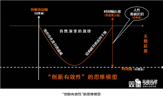 由此可以推導出,創新是創業活動的前提,是不得(dé)不為之的“生存幹預”。在這個(gè)幹(gàn)預過程當中大家要理(lǐ)解,它某種(zhǒng)程度(dù)上是滿足人性的底層(céng),它有一個不變的(de)規律就是(shì)在時間軸後移(yí)的(de)情況下創新有效變無效,所以創新(xīn)是一個無限延展的過程。