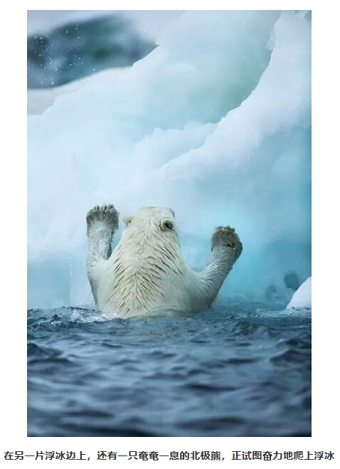 一隻北極熊媽(mā)媽,正帶(dài)著自己的孩子,在(zài)細碎的浮冰塊之間顛沛流離