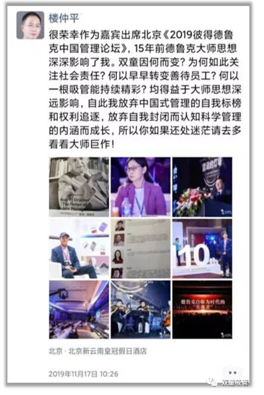 11月17日,“雙(shuāng)童”樓仲平作(zuò)為受(shòu)邀嘉賓出席了彼(bǐ)得·德魯克中國管(guǎn)理論壇。在論壇結束後,樓仲平在朋友圈發出了這樣的感歎: