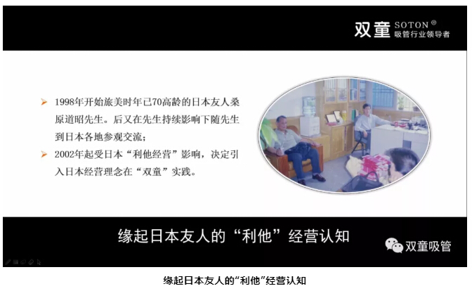 1998年(nián),“雙(shuāng)童”樓仲(zhòng)平結識了一位旅美(měi)日本友人桑原道昭先生。桑原道昭先生在美國待了45年,會一點漢語。他會和樓仲平交流做生意的看法,並用日本人的視角和思想解讀節能環保、節約土地、員工關懷等方麵的話題。