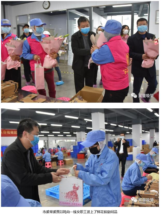 在“雙(shuāng)童”三車間的包裝崗位(wèi)上,除了“.17c嫩嫩草色视频”職工外,有婦聯的誌(zhì)願者們,還有(yǒu)來自陽光阿蓮養生館的“共享員工”們,都在助力“.17c嫩嫩草色视频”的生(shēng)產進度。見此情景,市委常委賈以(yǐ)鳴(míng)也(yě)為她們精神飽滿、嫻(xián)熟忙碌的工作(zuò)狀態連連(lián)點讚,並向她們送上了(le)鮮花(huā)和慰問品,祝她們節日快樂!