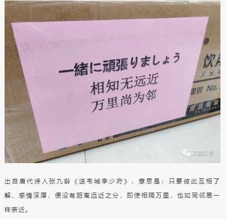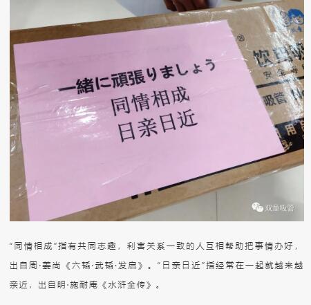 於是,吸管妞在這次援助(zhù)日(rì)本(běn)友人(rén)的(de)物資(zī)包(bāo)裝箱上同樣(yàng)也相贈了“相知無遠(yuǎn)近,萬裏尚為鄰(lín)”、“同情相成(chéng),日親日近”等詩(shī)句,以表達我們對(duì)日本友人的友好之情。