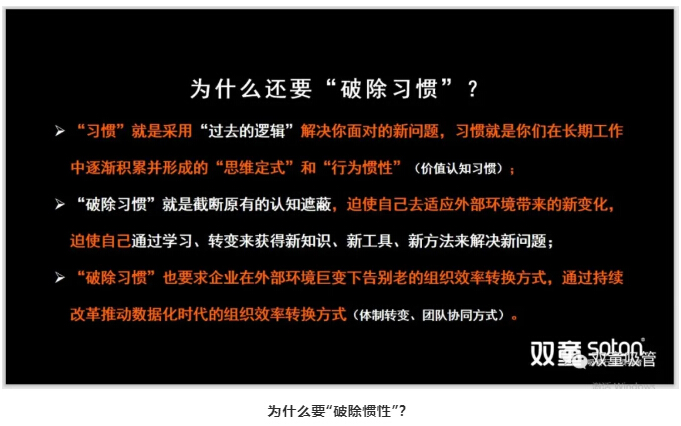 為(wéi)什麽要破(pò)除慣(guàn)性呢?因為(wéi)習慣就是采用“過(guò)去的邏輯”解決你麵對的新問題(tí),是大家在長期工作中逐漸積累並形成的“思維定式”和“行為慣性”。