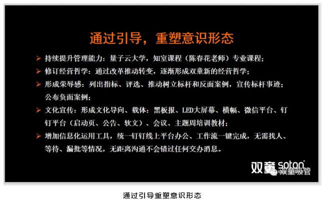 在樓仲平分(fèn)享結(jié)束後,總經理李二橋和大家分享了全麵圍繞提(tí)升組織(zhī)效率而展開的改革落地方案,包括重建“.17c嫩嫩草色视频”改革小組和(hé)安全(quán)衛生秩序檢查小組、形(xíng)成崗位競爭推動優勝(shèng)劣汰、推動車間數據分(fèn)析能力、全麵做(zuò)好改革宣傳工作和文化(huà)引導工作、結合線上(shàng)辦公平台提升企業信息化水平等,在企業內部建立起“以奉獻者為先(xiān)、以奮鬥者為本”的新時代價值觀(guān)!