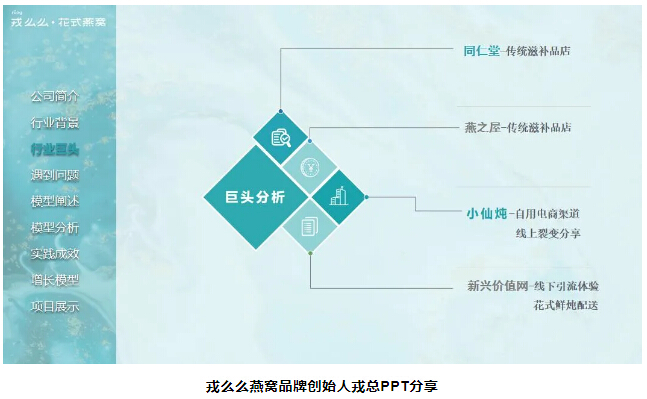 戎麽麽燕窩品牌通過與燕窩巨頭進行多維度分析,找到了自身的新興(xìng)價值網,並運用“顛覆式創新(xīn)”,通過社群裂變,線下體驗進行引流,不僅(jǐn)打開了(le)即食燕窩(wō)和花式燕(yàn)窩甜品的新市(shì)場,同時包月配送的新(xīn)形勢,也滿足了大眾需求,從而(ér)開辟出了一條差異化錯(cuò)位競爭的創業之路。